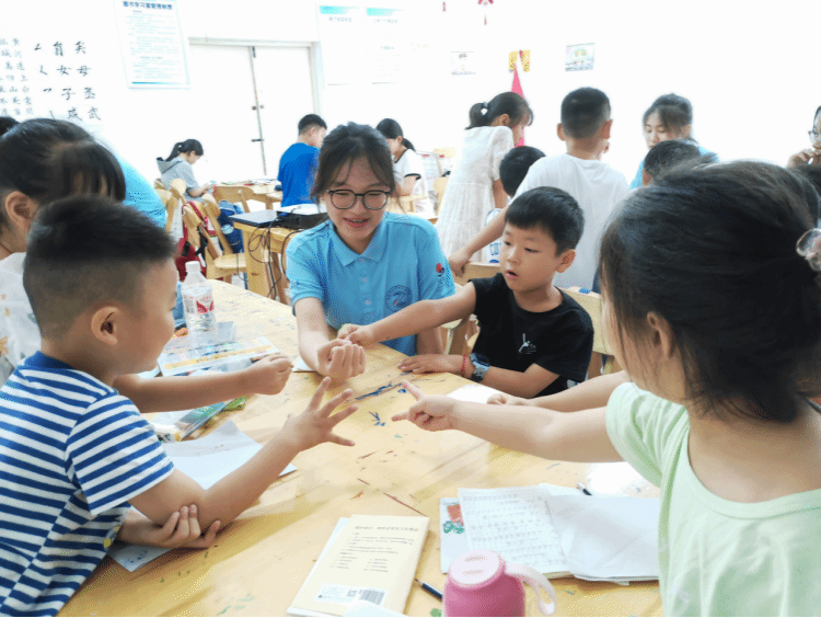 开班仪式上,指导老师、小先生们、社区小学员们齐聚一堂,大家用独特的方式相互介绍自己,小学员们热情高涨和对未来的课程学习充满期待。面对活跃的小学员们,小先生们有点招架不住,如何维持好教学和活动纪律成为小先生们开班遇到的第一个难题。指导老师傅文茹通过现场组织小学生如何听课,给小老师们示范如何通过游戏、有效口令等组织调动孩子们,并在课间给小老师们建议要重视根据孩子们的年级组建学习小组,在开班教学中针对6—12岁孩子的兴趣特征,创新教学方法,加强纪律和礼仪教育,全面提升孩子们的综合素养。傅老师的到来和指导不仅为知新行知学堂增添了欢声笑语,更为学堂后续的顺利开展增添了力量。