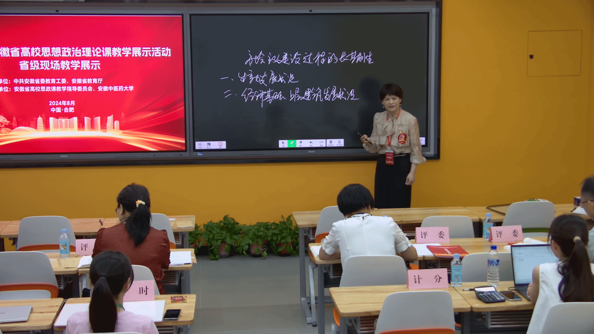 本次教学展示活动共有93所高校295名教师被推荐参加展示。经过首轮线上评选,共有113名思政课教师进入现场教学展示环节。现场教学展示分为研究生组、本科组和高职高专组,共七门课程,由全省高校思政课教指委七个分教指委具体组织实施。比赛现场随机抽取题目后即进行教学展示。刘英老师的教学展示题目是“社会主义建设过程的长期性”,她现场准备充分、沉着冷静,以扎实的理论知识、较强的应变能力完成了内容讲解,赢得了评委的充分肯定,展现出学院思政课教师的良好精神风貌。