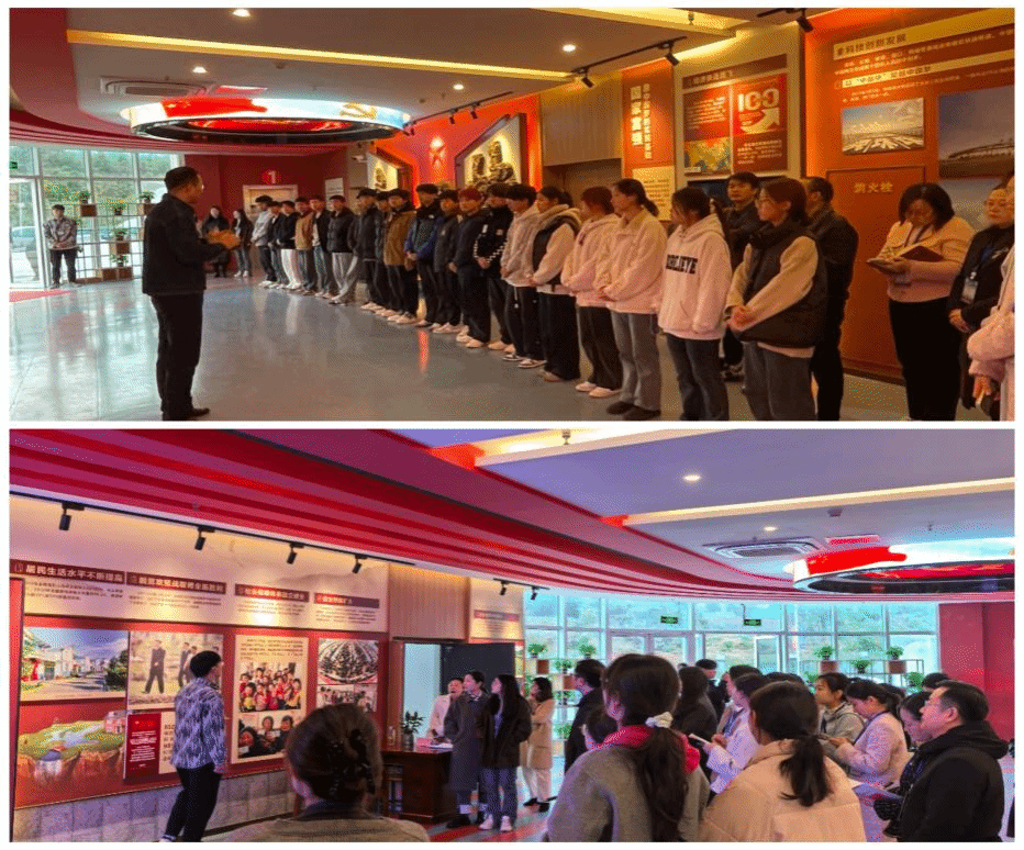 安徽财贸职业学院储锐老师在学校爱国主义教学基地进行了一堂思政课实践环节教学展示,通过组织学生分组寻找现实素材,共同探讨总结新中国走上中国特色社会主义道路的必然性。与会专家和教师还参观了爱国主义教育基地,安徽财贸职业学院党务工作专业2301班夏颜弟同学进行了详细讲解。