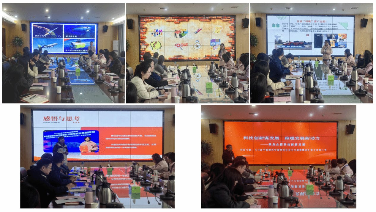 教学展示环节,围绕“科技创新”这一主题,来自共同体成员单位不同学段的五位教师,进行了精彩的授课展示。合肥市和平小学东校王舒璠紧密结合本校活动,让思政课变得接地气,易懂易行。合肥市第四十六中学王丽萍借用寻宝、抓娃娃等游戏模式,环环相扣,获得感强,充分调动起了学生的积极性。合肥市第二中学董云以“为什么、是什么、怎么办”的清晰思路,充分结合“科晚”,利用图文视频大大延展了课堂空间,带领学生感受科技的美好。合肥工业学校严昊深度结合学生专业规划和合肥科技发展战略,提出问题——解决问题——反思问题,紧紧抓住学生注意力。安徽艺术学院陆淮光侧重于理论深度的挖掘,围绕“变与不变”展开了一场紧贴时代的理论讲解。