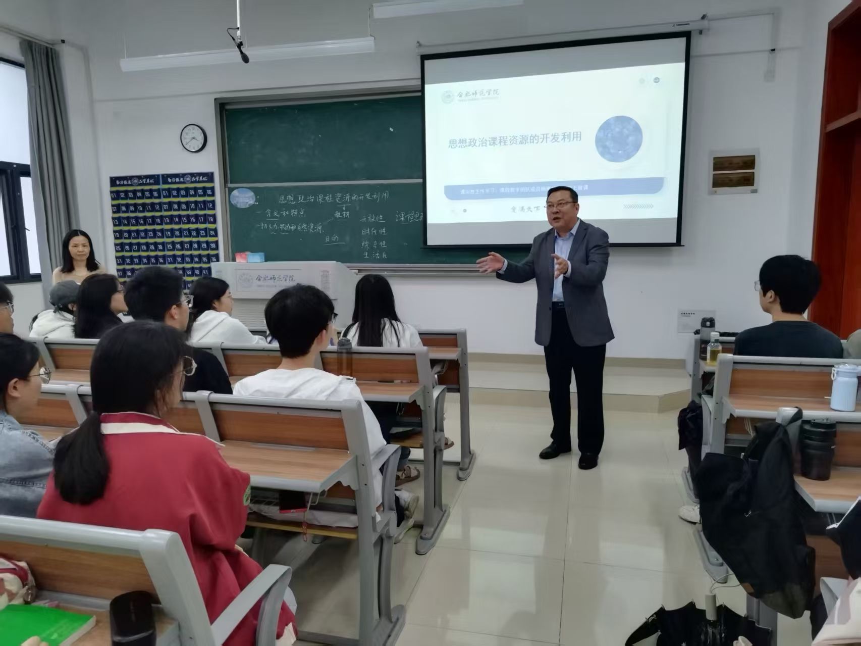 随后,在铭传楼B303教室,徐成钢走进思想政治教育专业课堂,旁听了石春梅老师的《思想政治学科教学论》课程并进行点评,指出专业课堂教学能够结合学生身边的鲜活案例,通过运用信息技术以及高质量的课堂互动,充分体现出“学生中心”育人理念。