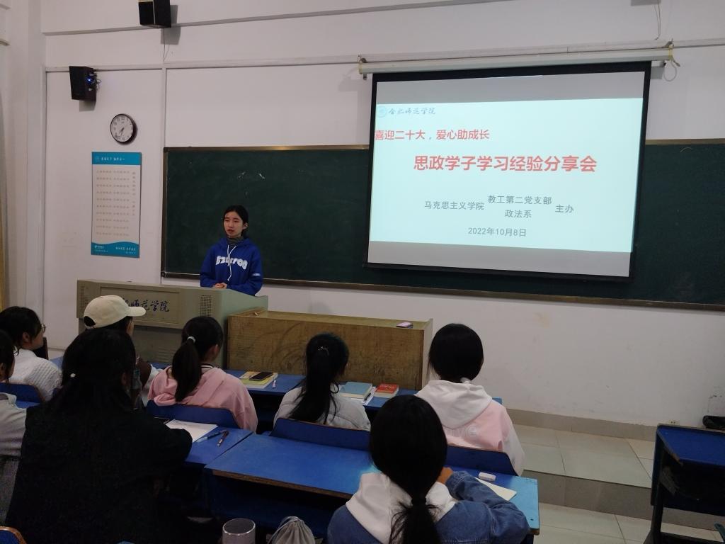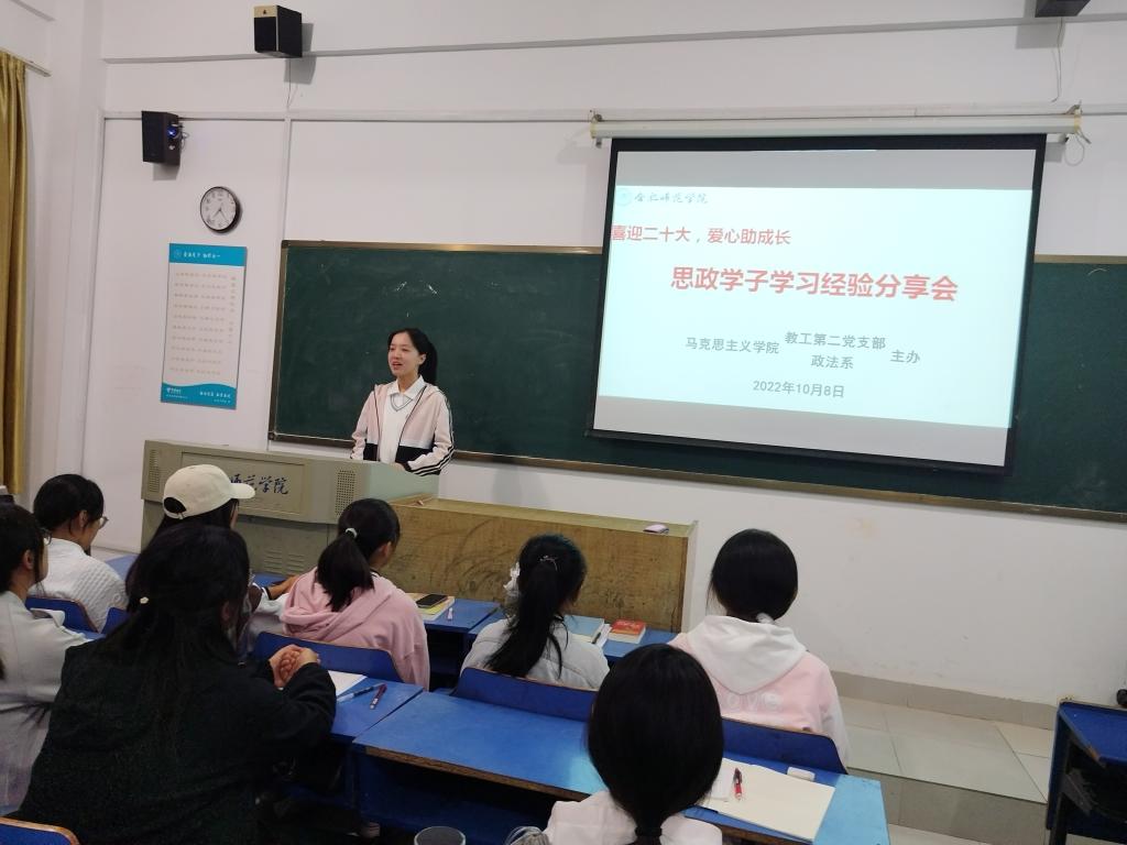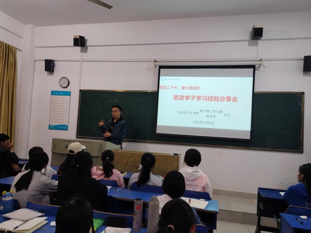 本网讯 为帮助2022级思想政治教育专业新生进一步了解大学学习的特点,尽快适应大学生活,10月8日晚,以“喜迎二十大,爱心助成长”为主题的新生适应性系列活动,在锦绣校区博约楼104教室举办。首次活动包括“思政学子学习经验分享会”和“大学学习方法微讲座”。2022级全体新生参加,活动由澳门十大信誉好的网站教工第二党支部与政法系联合主办。
