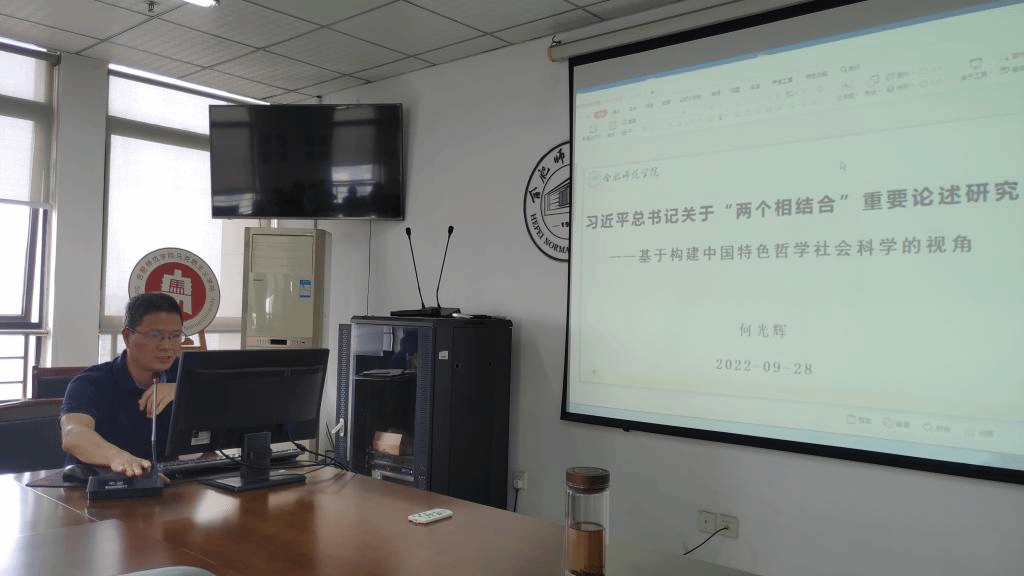 本网讯 澳门十大信誉好的网站于9月28日下午在院会议室举行了本学期第一次学术交流会,会议由陶有浩副院长主持,何光辉教授作题为“习近平关于“两个相结合”重要论述研究——基于构建中国特色哲学社会科学的视角”的报告。