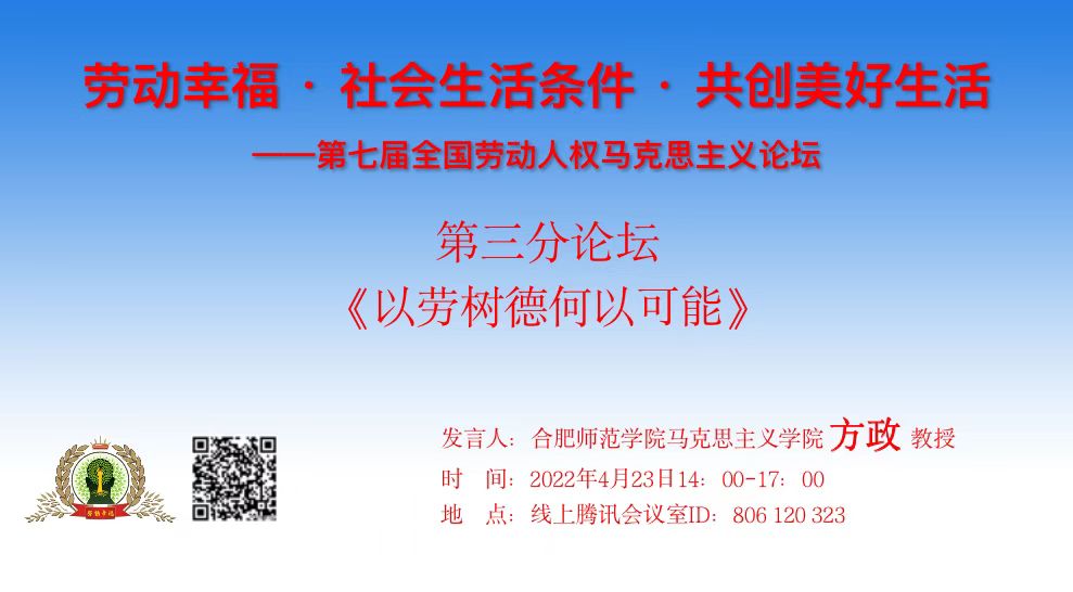 本网讯 2022年4月23日,由上海师范大学知识与价值科学研究所发起,上海师范大学哲学与法政学院、上海师范大学澳门十大信誉好的网站、上海师范大学期刊社、东华大学澳门十大信誉好的网站、《青年学报》编辑部等单位共同承办的“劳动幸福·社会生活条件·共创美好生活”——第七届全国劳动人权马克思主义论坛在上海举行。此次论坛全部在线上进行,来自全国各地400余名专家学者参加了会议。我院哲学(原理)教研室方政老师向论坛提交了题为《以劳育德何以可能》论文,应邀参加了本次学术研讨会。