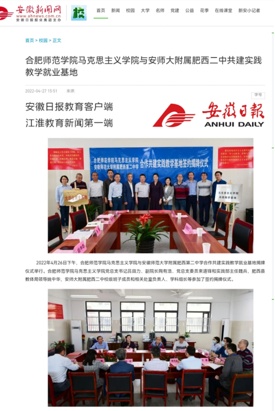 本网讯4月26日,澳门十大信誉好的网站与安徽师范大学附属肥西第二中学举行合作共建实践教学就业基地揭牌仪式。此举为进一步加强学院实践教学基地建设,推进就业工作的重要抓手,也为理论与客观实际充分结合提供平台,从而实现双赢。