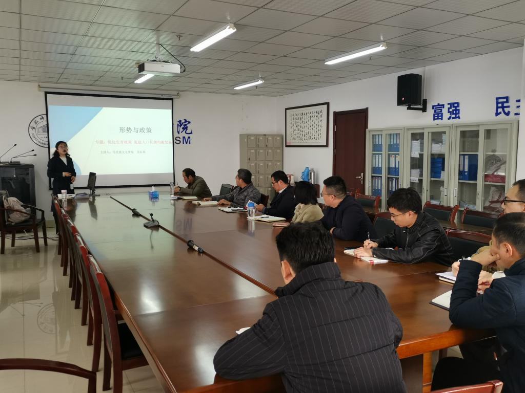 备课会上,特别邀请了吴石英博士做《优化生育政策促进人口长期均衡发展》的专题备课。吴石英从我国人口的发展趋势、生育政策的调整历程、优化生育政策促进人口长期稳定均衡发展三个方面做了生动而详细的授课展示。吴石英的授课,教学设计合理、内容丰富、生动活泼,用大量详实的数据充分说明了我国人口的历史变化和当前人口稳定均衡发展的紧迫性,获得了与会老师们的一致好评。