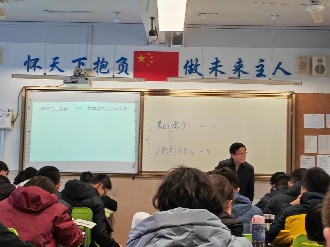 首先,张大勇老师在高一(6)班进行高一《思想政治·经济与社会》中的“坚持新发展理念”一课的讲课展示,张老师围绕本课课题设计总议题——“解读新发展理念”和两个分议题——“①新发展理念的设计原则是什么?②如何理解新发展理念?”他从联系上节课教学内容中引出新时代我国社会的主要矛盾内容,然后从主要矛盾两个方面内容的关系及其处理开始,围绕议题、情景、核心知识、价值追求引领学生探究“新发展理念的原则——以人民为中心”和“五大新发展理论”。讲课过程中,张老师围绕议题举例经典,深入浅出,启发学生不断思考“是什么”“为什么”“怎么做”,让学生在思考解决我国社会主要矛盾的过程中认识到坚持以人民为中心的新发展理念的重要意义,尤其是运用合肥城市创新案例“一案到底”全面分析创新理念在我国经济社会发展中的重要作