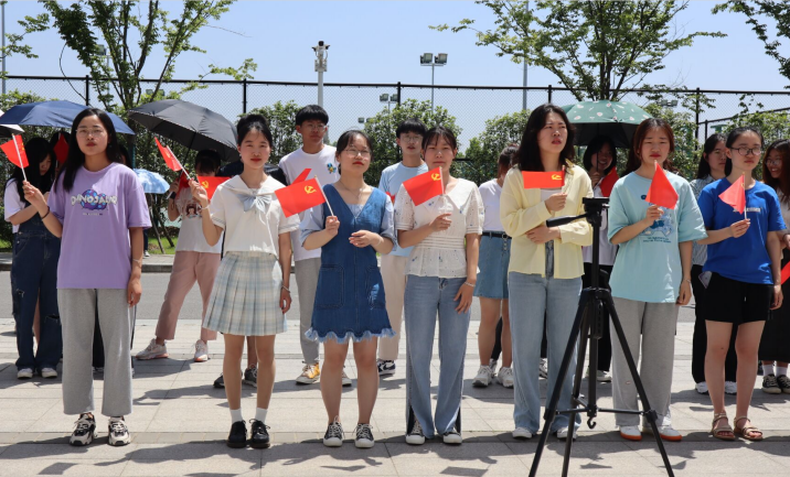 本网讯 为了更好迎接党的百年华诞,澳门十大信誉好的网站思想政治教育专业学生以集体朗诵《党旗颂》的“快闪”形式,庆祝中国共产党成立100周年。日前,这一“快闪”活动在滨湖校区铭传楼前广场多次成功举办。