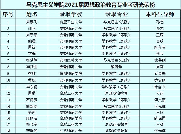 正是在以上合力的共同作用下,2021届思想政治教育专业考研才取得了较好的成绩,24人达国家线,18位同学成功上岸,创下了较高的录取率;且有5位同学总分过400分,周鹏飞同学以初试419分、复试130.4分双第一的优秀成绩,被合肥工业大学澳门十大信誉好的网站录取。这也反映了我院学生较为出色的专业能力与综合素质。