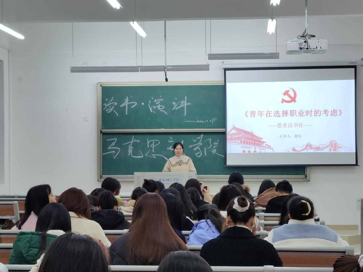 读书会以马克思的《青年在选择职业时的考虑》为研读对象。19级翁仪同学作为本次读书会主读人,首先从思想主题、逻辑结构、当代意义等方面对文章进行了深度剖析。随后,宣恒天、李微、胡争等同学轮番上台,展示自己对于文章的理解及感悟。同学们一致认为,作为新时代思政专业学子更应以马克思为榜样,在未来的生涯规划时,勇于担当,选择能够为人类幸福而工作的职业,成为能够担当民族复兴大任的时代新人。