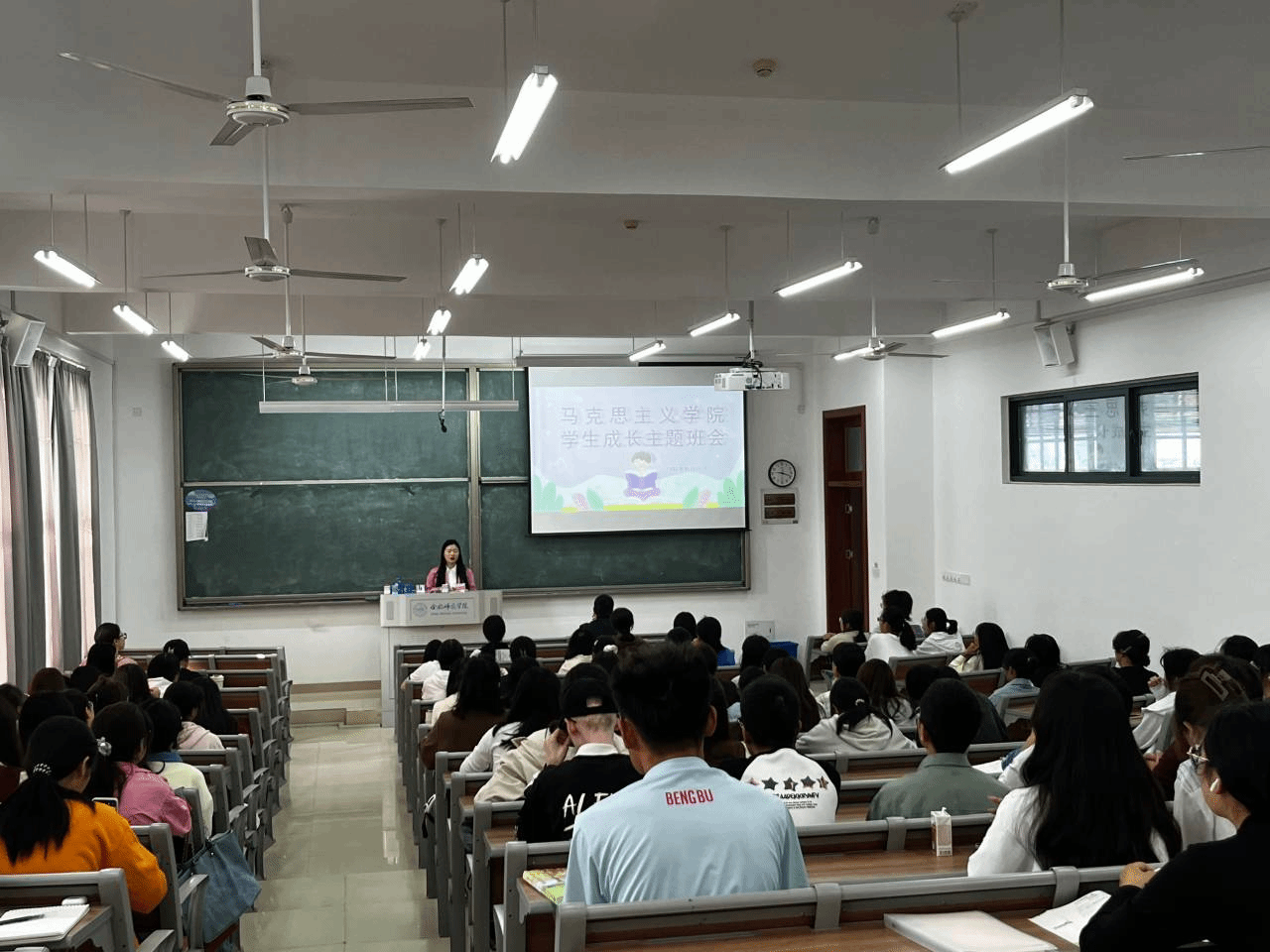 王萌传达了学校举办的校园消防安全知识讲座有关精神,通过列举相关高校火灾案例,引导学生高度重视消防安全,严禁在宿舍使用违规电器,离开宿舍时切断电源,坚决杜绝用电安全问题。同时,她要求同学们保护好人身财产,提升加强防诈骗和防传销的意识。