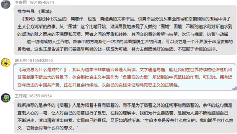 活动伊始,由陈玉钊同学组织大家在线上分享自己的读书感悟。同学们将各自所阅读的书籍进行分享、推荐和讨论,从而互相学习,共同享受阅读带来的快乐。此外,本次活动还组织了小组最佳读书笔记推优评选,从分成的五小组中各自选一位最佳读书笔记,并在线上向大家阐述推荐的理由,这个环节使大家对于推荐的优秀书籍有了更加全面和深层次的了解。