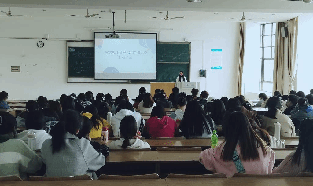 班会上,王萌结合典型案例与实际情况,向同学们讲述了假期及运动会期间的安全注意事项。本次班会内容涉及意识形态教育、生命和心理安全教育、安全防范教育、卫生健康教育、宿舍安全管理和学风建设教育。引导学生正确对待成长过程中的压力,关注生命和心理健康,树立正确的人生观;呼吁学生树立正确的消费观,谨防诈骗,保护财产安全;提醒同学们注意防范春季传染病毒,注意饮食安全,不吃垃圾食品;教育学生受到安全方面的问题应及时向辅导员报备并寻求帮助。王萌强调了学生要注重保护自身的人身安全,同时希望学生合理安排作息时间,养成良好的生活习惯,做好学风建设,树立规则意识。