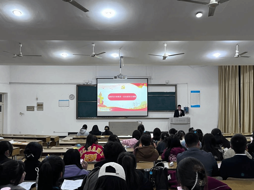“奋楫笃行结硕果,法治建设正扬帆”2021级思想政治教育班王双桥同学向我们展示了党的法治探索历程与法治中国的成就,而后点明新时代青年的使命与担当,要用理论指导实践,努力提升自身素质和修养。