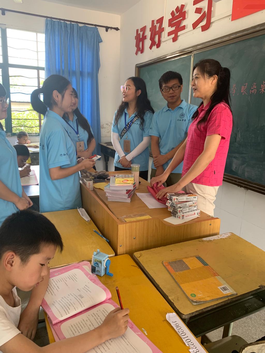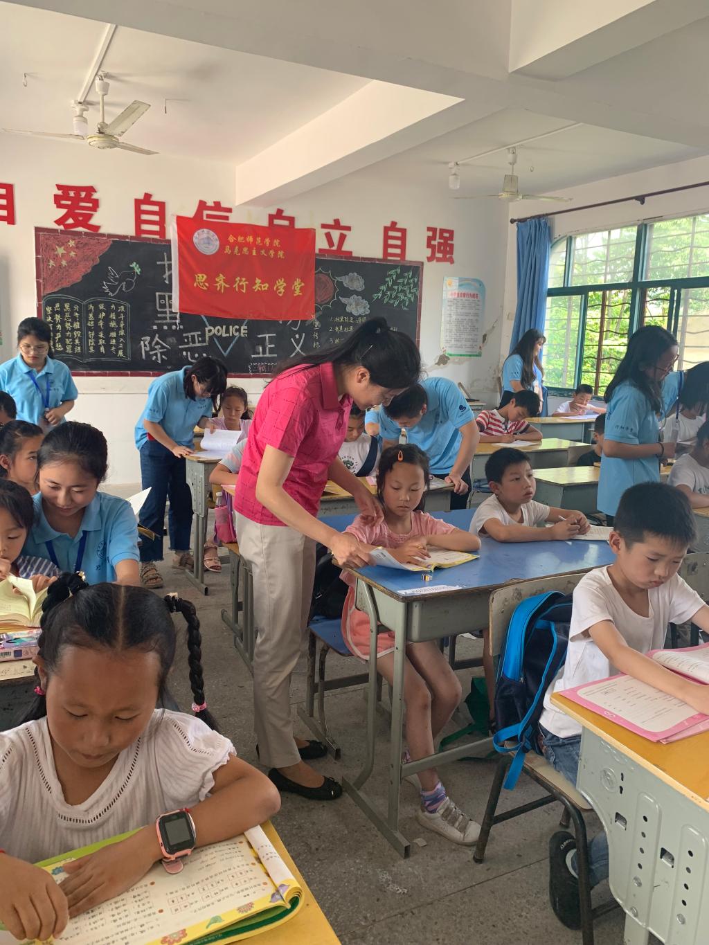 吕田力、王萌刚抵达绿岭完全小学教室,就看见“小先生”们在专心致志的指导“小学员”们写暑假作业,耐心细致的为“小学员”解答。 。