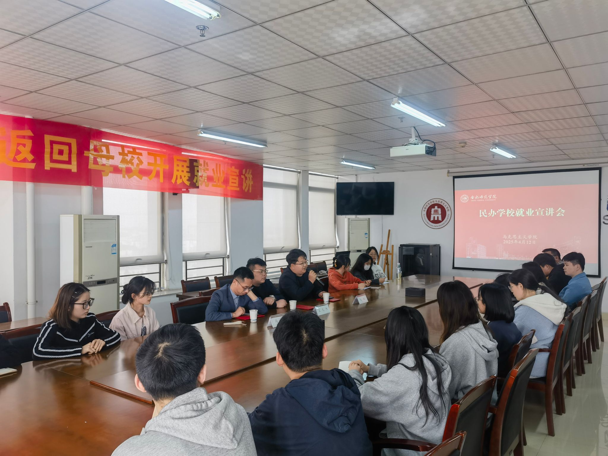 为拓宽思想政治教育专业师范生就业渠道,引导学生科学规划职业生涯,4月12日下午,学院邀请合肥东辰职业学校王元杰、浙江温州乐清知临中学马硕及合肥锦绣中学王雄等优秀校友返校开展民办学校就业专题宣讲会。学院党政领导班子成员、政法系主任、毕业班辅导员及2021级、2022级思政专业学生代表参加了此次活动。宣讲会由院长何光辉主持。