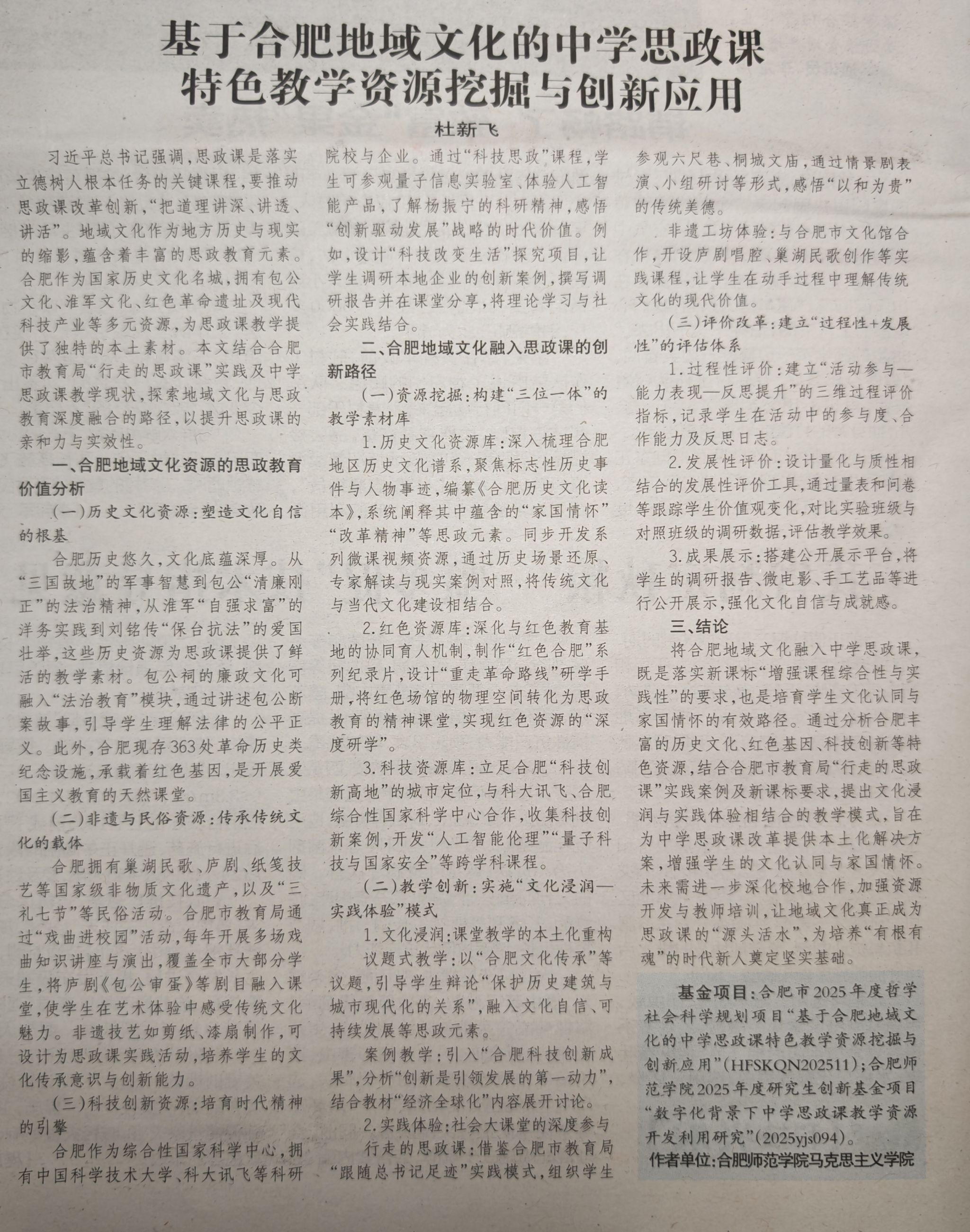 本次发表的文章是杜新飞的合肥市2025年度哲学社会科学规划项目“基于合肥地域文化的中学思政课特色教学资源挖掘与创新应用”(HFSKQN202511)和澳门十大信誉好的网站2025年度研究生创新基金项目“数字化背景下中学思政课教学资源开发利用研究”(2025yjs094)的阶段性成果。文章聚焦思政课建设主题,从合肥地域文化资源的思政教育价值分析、合肥地域文化融入思政课的创新路径、结论三方面展开论述,提出了通过“资源挖掘:构建‘三位一体’的教学素材库”“教学创新:实施‘文化浸润—实践体验’模式”“评价改革:建立‘过程性+发展性’的评估体系”创新路径,让合肥地域文化在中学思政课教学中展现魅力。