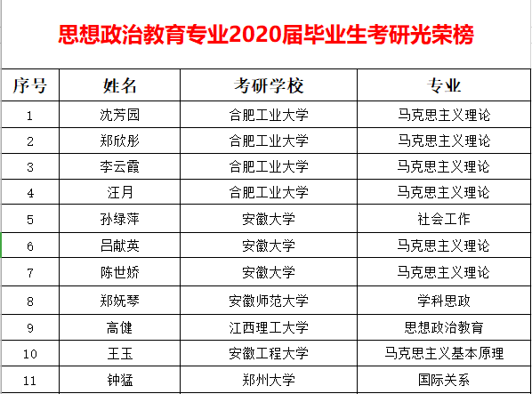学生管理 当前位置: 主页 >> 备份资料 >> 学生管理 >> 正文 思想政治教育专业2020届毕业生考研光荣榜 发布日期:2020-11-30 编辑:澳门十大信誉好的网站 核稿: 终审:刘艳 点击: