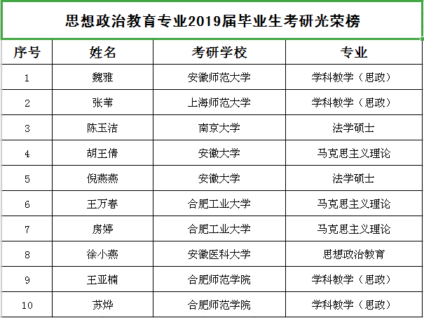 学生管理 当前位置: 主页 >> 备份资料 >> 学生管理 >> 正文 思想政治教育专业2019届毕业生考研光荣榜 发布日期:2020-05-07 编辑:澳门十大信誉好的网站 核稿: 终审:刘艳 点击: