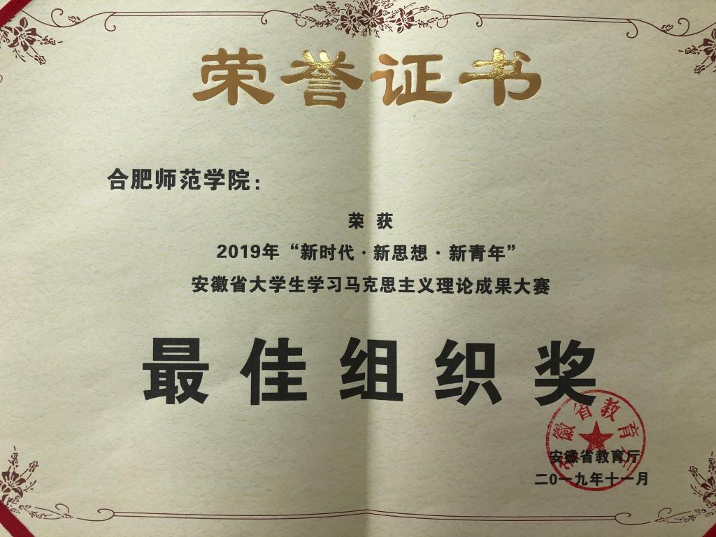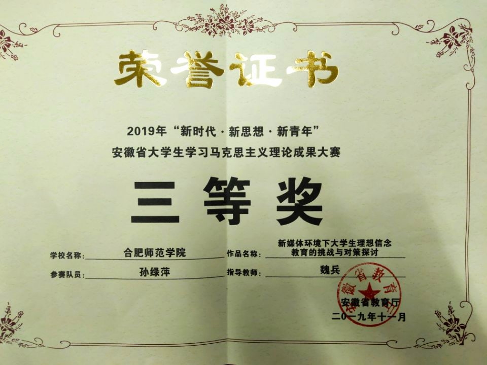 11月2号上午8:00总决赛帷幕正式拉开。两位参赛选手史俊兰、孙绿萍在张淑华、魏兵的指导下认真做好了准备。经过激烈的争夺,最终史俊兰凭借《安徽地方名人文化融入高校思想政治教育的路径探析》一文荣获2019年“新时代·新思想·新青年”安徽省大学生学习马克思主义理论成果大赛的二等奖;孙绿萍凭借《新媒体环境下大学生理想信念教育的挑战与对策探讨》一文荣获2019年“新时代·新思想·新青年”安徽省大学生学习马克思主义理论成果大赛的三等奖;澳门十大信誉好的网站荣获2019年“新时代·新思想·新青年”安徽省大学生学习马克思主义理论成果大赛的“最佳组织奖”。